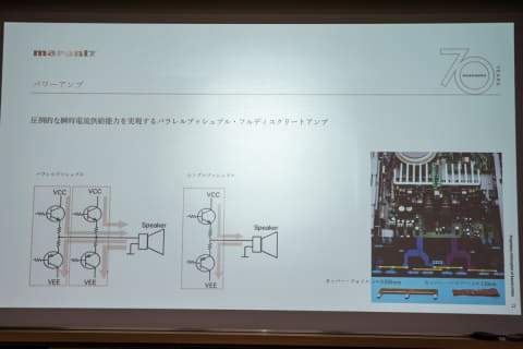 マランツのHi-Fiアンプの特徴でもある、フルディスクリート構成の電流帰還型増幅回路をプリアンプ部に採用。「ハイスピードでS/Nが高く、低歪という特長を備える非常に優れた増幅回路」だという。