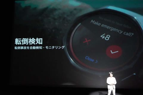サイクリング中、信号待ちなどで一時停止すると、スマートウォッチ側の計測も一時停止するほか、GTシリーズでは初めて転倒検知と緊急通報機能も搭載した。