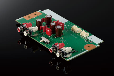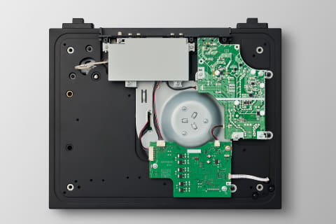 内部の電源回路、モーター制御回路、フォノイコライザー回路は、それぞれ独立した基板で構成。各基板間は干渉を防ぐために交差することなく配線されている。さらに、トーンアームおよびカートリッジの移動経路から離れたレイアウトとすることで、カートリッジに与える影響を最小化した。