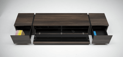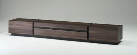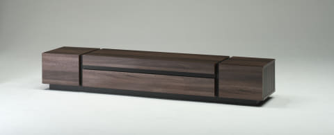 ローボード本体は、高級感のあるダークブラウン木目仕上げで、リビングのインテリアに自然に馴染むデザイン。引き出しにはスライドレールを採用し、AV機器やメディア、リモコンなどをを収納できる。
