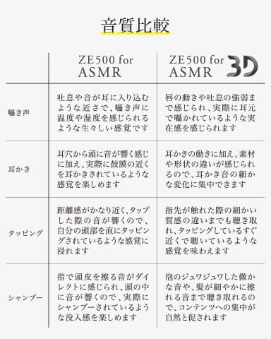 既存のZE500 for ASMRとの聴こえ方の違いとしては、「ささやき声」のコンテンツの場合、ZE500 for ASMRでは「吐息や音が耳に入り込むような近さで、囁き声に温度や湿度を感じられるような生々しい感覚が特長」なのに対し、新登場のZE500 for ASMR 3Dでは「唇の動きや吐息の強弱まで感じられ、実際に耳元で囁きかけられているような実在感を感じられる」という。