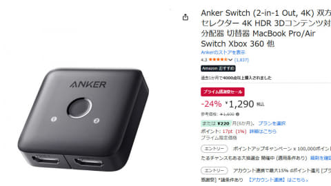 Amazonのプライム会員限定セール「プライム感謝祭」が10日23時59分まで実施中。HDMI切替器も低価格になっており、10日15時に編集部が確認したところ、Ankerの2入力/1出力タイプが通常1,690円のところ24% OFFの1,290円、4入力/1出力タイプが通常3,990円のところ25% OFFの2,990円となっている。