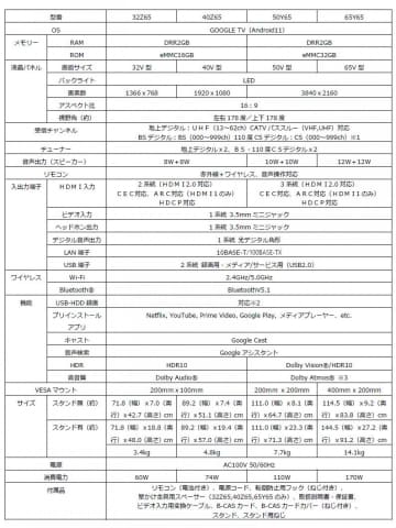 バックライトは全機種LED。解像度は32型が1,366×768ドット、40型が1,920×1,080ドット、50/65型が3,840×2,160ドット。