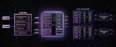 1bit DACは、L+、L-、R+、R-それぞれのチャンネルに16EのPWM-DACを備えた、合計64枚のディスクリートPWM-DAC回路を採用。このPWM-DAC回路群の「配線遅延」を最新のFPGA-Master3.0テクノロジーによって補正することで、I/Oレイテンシを正確に制御。「厳密にDACへと完全な同期を叶え、サウンドの緻密さと解像度を大幅に向上している」とのこと。