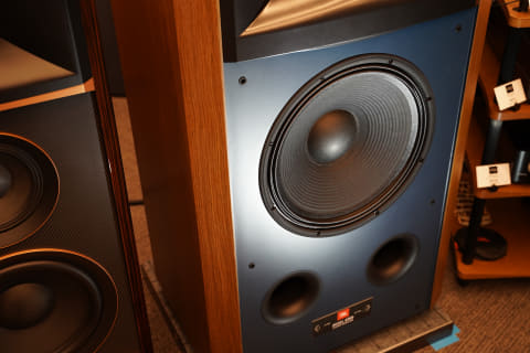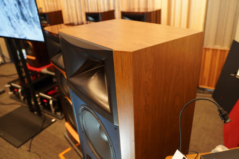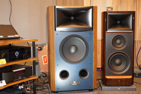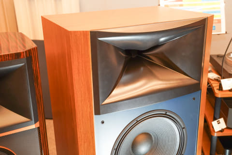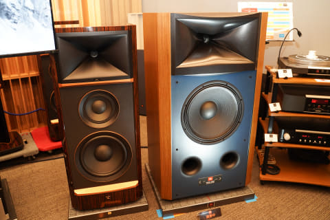 JBLスタジオモニターの伝統であるブルーバッフルと、ウォルナット天然木突板仕上げのエンクロージャーを採用。既存の最上位である「JBL 4367」と比べると背が高くなっており、HDIホーンの位置が、リスナーの耳の位置にくるようになったという。