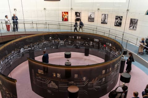 スパイラルガーデンのアトリウムには、ライカ100年の軌跡をひとつの“渦”で表現した空間が登場。自然光が差し込む昼間と夜で表情が変わり、夜にはライカギャラリー・インターナショナル代表兼アートディレクター、カリン・レーン=カウフマンのキュレーションによる100点の写真作品がプロジェクション映像として投写される。