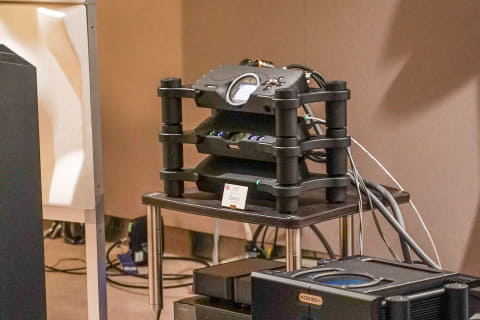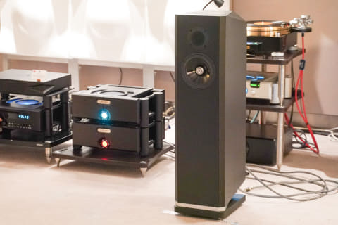 タイムロードのブースでは、高い評価を受けているKUDOSのスピーカーを紹介。そのフラッグシップモデル「Titan808」も初公開された。質の高い低域再生を追求した結果、上下でエンクロージャーを分割し、超低音共鳴を排除している。会場では、電気を使わない専用チャンネルデバイダーのSigao Driveと、Chordの「Ultima3」、「Ultima5」を使いマルチドライブ再生を行なっている。