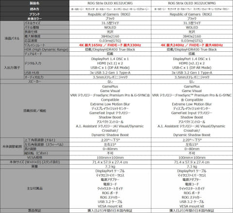 2モデルの大きな違いは対応リフレッシュレートで、ROG Strix OLED XG32UCWGは4K最大165Hz、フルHDモード最大330Hzに、ROG Strix OLED XG32UCWMGは4K最大240Hz、フルHDモード最大480Hzに対応する。