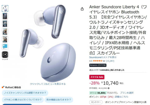Amazonは、11月4日23時59分まで「スマイルSALE」を開催している。Ankerの完全ワイヤレスイヤフォンなどもセール対象となっており、10月29日15時40分に編集部が確認したところ、「Soundcore Liberty 4」が通常14,990円のところ28% OFFの10,740円、イヤカフ型「Soundcore C40i」は通常12,990円のところ23% OFFの9,990円で販売されている。