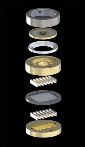 スピーカーハウジングの材質には真鍮とステンレスを併用。サファイアクリスタルのフェイスプレートからパッシブラジエーターが見える。