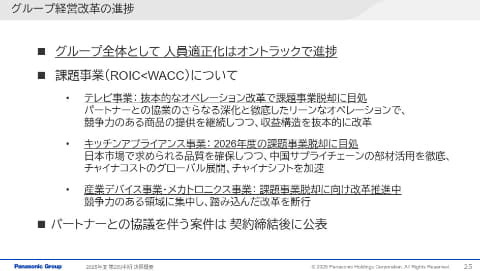 パナソニック ホールディングスは30日、2025年度第2四半期決算の会見の中で、課題事業と位置付けているテレビ事業について、収益改善の目処がついたと説明。楠見雄規社長は「抜本的なオペレーションの改革で、WACC(加重平均資本コスト)以上のROIC(投下資本利益率)の達成に目処をつけました」と説明。2026年にも課題事業から脱却させるという。