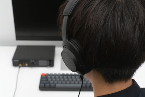 付属のケーブルを使うと、有線ヘッドフォンとしても使用可能。ワイヤレス接続の約10分の1という低遅延接続を実現できる。一般的なワイヤレスヘッドフォンは、有線接続時に内部のDSP回路がバイパスされて音質が変化してしまうことが多いが、UX5000はDSP回路を経由してアナログ出力する設計のため、高音質仕様はそのままに、専用プレーヤーへの接続やミキシング作業、動画編集、ゲームプレイにも活用できる。