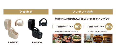 パナソニックは、耳掛け式のオープン型完全ワイヤレスイヤフォン「RB-F10D」を購入して応募すると、抽選でグルメや宿泊ギフトが当たる「RB-F10D ご褒美キャンペーン」を、11月11日から開始する。対象の購入期間は11月11日~2026年1月16日、応募期間は2026年1月30日まで。