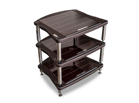 各棚板の裏面に、CDプレーヤーやアナログ・ターンテーブルの影響から発生する共振のピークポイントである1.5kHzを低減させる独自のダンパーを搭載する。