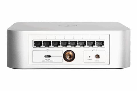 Ethernetの動作基準クロックである25MHzと同じ25MHzクロックを、定評のあるTCXOクロックベースで新規開発。周波数精度±0.1ppm以内という高スペックを実現し、一般的なネットワークスイッチと比べ、主要ジッターパラメーターを47.6%低減。ネットワーク上の遅延とジッターの問題を解決し、正確なデータ伝送を実現したとする。25MHzマスタークロック用BNC端子も備える。