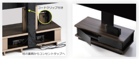さらに、強化ガラス扉付きの収納部を標準装備しており、レコーダーやゲーム機器などの周辺機器をホコリや汚れから守りながら収納することが可能。