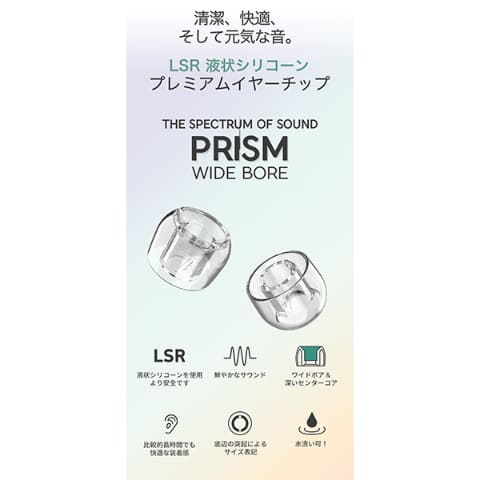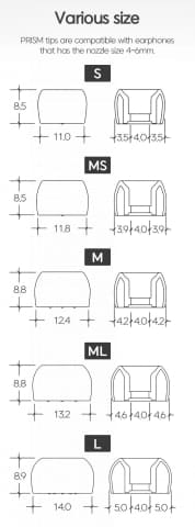 サイズ展開は、S(径11mm)、MS(径11.8mm)、M(径12.4mm)、ML(径13.2mm)、L(径14mm)の5種類。今回新たにMLサイズが追加され、より細かなフィッティングが可能になった。なおPRISMシリーズは欧米市場も意識したやや大きめのサイズ設計となっており、Lサイズは一般的なイヤーピースのLよりも大きめだという。