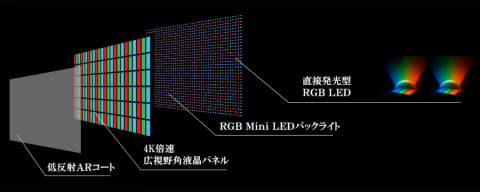 最大の特徴は、赤・緑・青の3色が独立駆動するミニLEDチップを光源とした「RGB Mini LED液晶パネル」の採用。採用するミニLEDチップは、量子ドットによる“波長変換”を行なわず、赤色、緑色、青色がそのまま光る“直接発光型RGB LED”となっている。