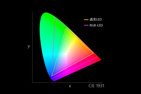 直接発光型RGB LEDは、青色ミニLEDに黄色などの蛍光体を組み合わせることで“白色”を作る従来タイプに比べ、色の濁りが無く、ピークの鋭い分光エネルギーを生み出せる。これにより、「自然界の豊かな色彩から夜景の光のニュアンスまでリアルに再現」できるようになるという。