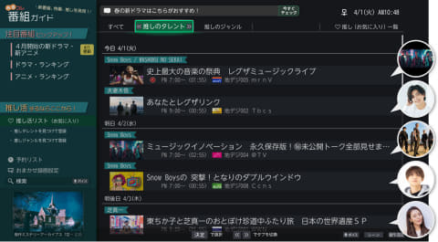 ほかにも、地デジ番組を最大6チャンネルまるごと録画する「タイムシフトマシン」や2画面表示機能の「ダブルウィンドウ」、気になるアイドルや俳優、アーティストを登録すると、そのタレントだけを集めた“出演番組スケジュール”を作ってくれる「みるコレ 番組ガイド」、気になる番組の配信先を表示してくれる「番組こねくと」などのスマート機能も備えている。