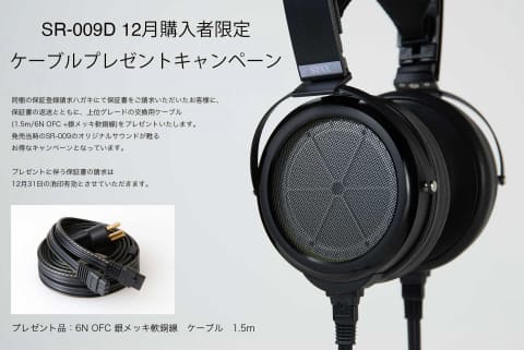 製品に同梱される保証登録請求ハガキにて保証書を請求した人に、保証書の返送とともに、上位グレードの交換用ケーブルをプレゼントいするもので「発売当時のSR-009のオリジナルサウンドが甦るお得なキャンペーン」とのこと。プレゼントに伴う保証書の請求は12月31日の消印有効。