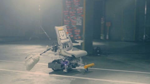 1カ月半の苦闘の末、両チームはモンスターマシンを誕生させる。凄いスピードで走って、手がとび出す。まっすぐ走って、その後に……。はたして、複雑な機構を組み込んだオフィスチェアは、見事に旗をつかむのか? 勝利の行方は?