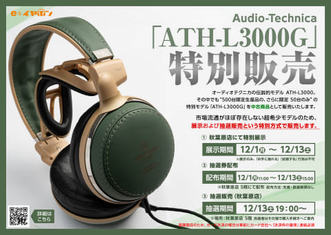 e☆イヤホン秋葉原店では、世界限定50台で発売されたオーディオテクニカ「ATH-L3000G」のシリアルナンバー《1/50》の貴重な個体を特別展示するほか、抽選販売を行なう。詳細はWebページを参照のこと。
