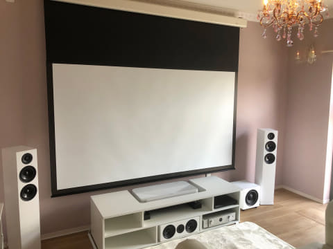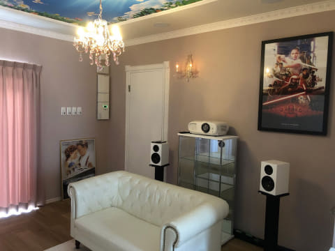 ビクター最新8Kプロジェクター「DLA-V800R」と、最大15ch(7.2.6ch)構成のイマーシブオーディオ(Dolby Atmos/DTS:X/Auro-3D対応)を設置。1機器1回路の専用電源環境に加え、家庭用&劇場用スピーカー双方の視聴比較ができる。