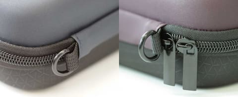 ケースはダブルファスナーで、左右どちらからでもスムーズに開閉可能。左右の止部にはストラップホールがあり、ショルダーストラップを付けたり、お気に入りのキーホルダーを取り付けたりできる。