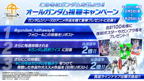 12月5日より、公式Xで「この冬はガンダムを観よう‼ オールガンダム視聴キャンペーン」がスタート。各種配信サービスでガンダムシリーズのアニメ本編を視聴し、キャンペーンに応募すると、抽選で合計100名に復刻ポスターやガンプラなどをプレゼントするもの。締切は2026年1月29日まで。