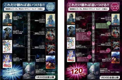「機動戦士ガンダム 閃光のハサウェイ キルケーの魔女」の公開に先駆け、宇宙世紀シリーズの作品を振り返るためのロードマップを公開。手軽に主要作品を押さえられる「ショートコース」と、宇宙世紀の世界観をじっくり深く堪能できる「じっくりコース」の2種類が用意されている。