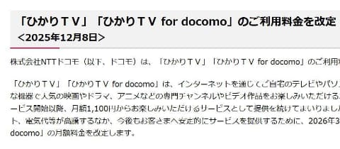 NTTドコモは、「ひかりTV」と「ひかりTV for docomo」について、2026年3月1日から月額料金を改定する。ひかりTVの月額料金は基本プランは現在の1,100円から1,210円、専門チャンネルプランは同2,750円から3,300円、専門チャンネル・ビデオプランは同3,850円から4,400円に値上げされる。