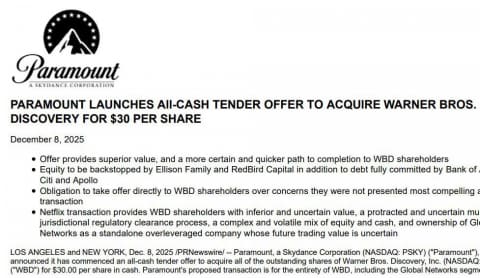 米Paramountは現地時間12月8日、米Warner Bros. Discovery(WBD)の買収に向けて、株式公開買い付け(TOB)を行なうと発表した。TOBでは1株あたり30ドルで買い取り、買収総額は1,084億ドルとなる見込み。WBDを巡っては、米Netflixが主要事業の買収で合意しているため、2社による争奪戦となる。