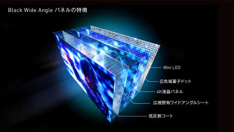 レグザゲーミングモニター初の4KミニLED採用「ブラックワイドアングル液晶パネル」を採用したモデル。1,152分割のミニLEDバックライトと量子ドットフィルムにより、高輝度・高コントラスト・広色域の映像表現を実現した。色域はDCI-P3を99%カバーする。
