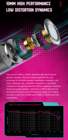 根本からYUME専用に再設計したという10mmダイナミックドライバーを採用し、20Hz~20kHzの全帯域でTHD+N 0.4%未満という優れた精度を実現。本ドライバーにはL.S.Wメタルリアチャンバーが搭載されており、定在波を低減するように内部の吸気・排気バランスを緻密に調整するという。