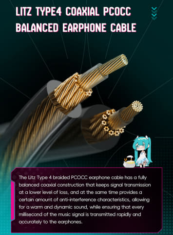 0.78mm 2ピン規格の着脱式ケーブルデザインが採用されており、Litz Type 4編組のPCOCCケーブルが付属する。信号ロスを徹底的に抑制するフルバランス同軸構造が組み込まれ、音の新となる信号を外部ノイズから保護して、クリアで濁りのない伝送を追求。