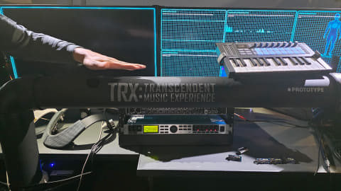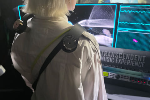 いわゆる肩掛けスピーカーの形をしたデバイスが用意され、これを身につけると、重低音が振動として胸部に伝わり、音を聴覚ではなく、触覚で感じられるという仕組みです。さらに振動とともに風が発生する仕掛けも。目と耳以外の感覚も使うことで、音楽の迫力やライブ感を実現しています。