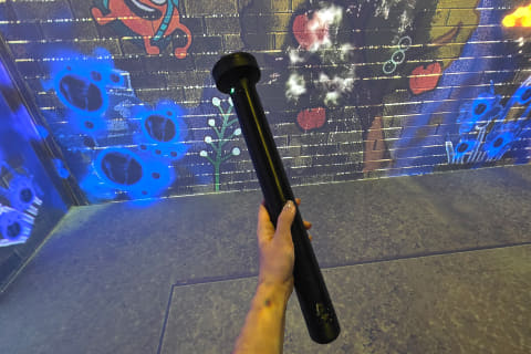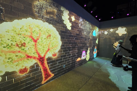 会場は、壁と床に映像投影するプロジェクションマッピングのゲーム空間。コントローラーが消防車のホースのような役割になって、壁の汚れを洗い流す動作に連動して、映像と音、さらには風や振動、香りが発生する仕組みになっています。