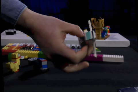 以下の例は、LEGOブロックの色を認識している例。くっつけるLEGOブロックの色を変えると、スマートブロックはその色を認識し、LEDが認識した色に光る。