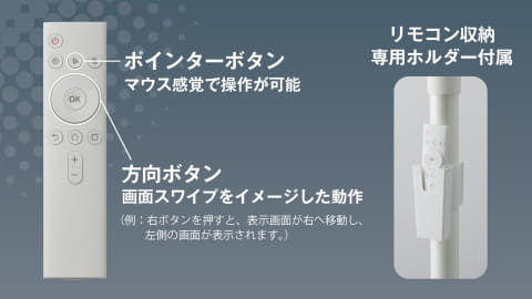 付属のリモコンには、マウスカーソルのように画面上で操作できる「ポインターボタン」を搭載しており、タッチ操作が難しい離れた場所からでも操作可能。スタンド部分は無段階で約20cmの高さ調節機能を有し、シーンに合わせて見やすい位置を調節することができる。