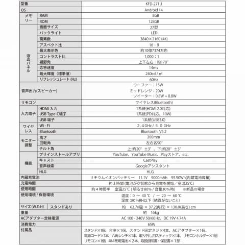 Android 14を搭載しているためGoogle Playからアプリをダウンロード可能。また、ミッドレンジ(20W)、ウーファー(15W)、ツイーター(0.8W+0.8W)をそれぞれ独立で搭載した合計36.6Wの高出力スピーカーを本体とスタンドに内蔵している。