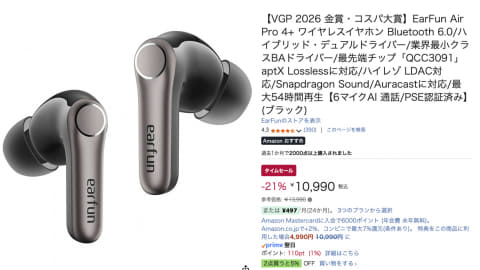 Amazonにて、EarFunのイヤフォン・ヘッドフォンがセール中。22日14時30分に編集部が確認したところ、「Air Pro 4+」は通常13,990円のところ10,990円になっている。