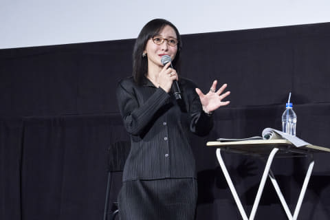 榎戸は来場者に向けて、「今回は、スタッフだけのトークショーだったので来てくださるか不安だったのですが、お寒い中、来てくださってありがとう、こちら側のニュータイプさん」と呼びかけ、来場者をわかせた。