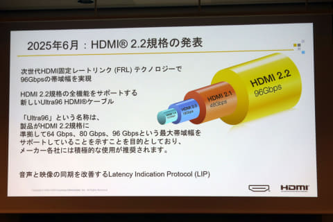 2025年6月に発表されたHDMI 2.2は、伝送幅の拡張や映像・音声の同期ズレを補正する機能を盛り込んだ次世代HDMI規格。