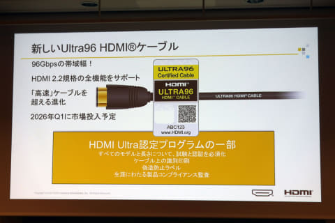 HDMIのマーケティングやプロモーション、ライセンス供与、管理を行なう組織「HDMI LA」のロブ・トバイアスCEOは30日、都内で説明会を開催。HDMI 2.2規格の全機能をサポートした次世代HDMIケーブル「ULTRA96」が、2026年第1四半期に市場投入される予定だと明かした。96GbpsをサポートしたHDMI 2.2製品については、2027年~2028年頃の登場を見込んでいるという。