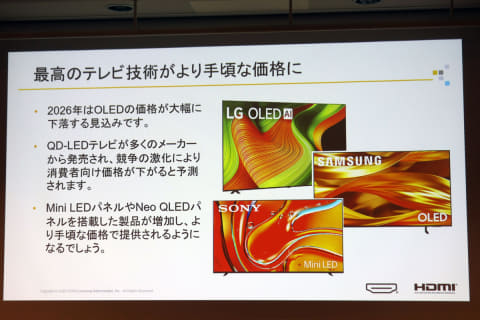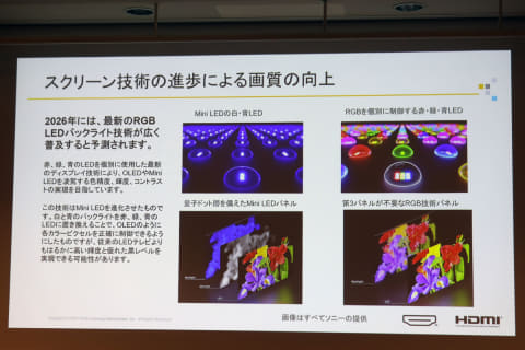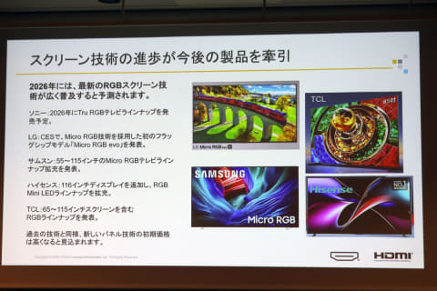 トバイアス氏は「AIを活用したゲーム映像の高解像・ハイフレームレート化は今後も拡張し、HDMIの大容量で安定した伝送が欠かせなくなるだろう。また今年、主要テレビメーカーからはRGB LED液晶テレビが登場し、広く普及することが予測される。これまで高価だった有機ELテレビも大幅に安価なモデルが登場し、ミニLED×量子ドット搭載液晶テレビにおいても手頃な価格で提供されるようになる」と分析。
