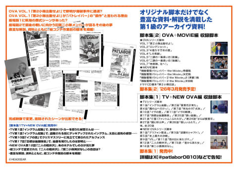 脚本集[2]では、劇場版2作(機動警察パトレイバー the Movie・機動警察パトレイバー2 the Movie)の準備稿と決定稿、シリーズの原作・原点と言えるOVAシリーズの脚本に加え、2万字を超えるロングインタビューを収録したアーカイブ資料の決定版。「脚本集[1]同様に700ページオーバーの読み応えある一冊に仕上がっている」とのこと。