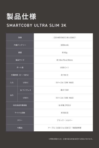 バッテリー容量は3,000mAhで、「大容量で重くなる方向ではなく、『ちょっと足りない(不安な)時がある』を軽く解決するためのちょうどいい容量」だとする。Qi規格のワイヤレス充電とMagsafeに対応し、最大7.5Wのワイヤレス出力に対応。USB-C経由の有線接続時は最大10W出力もできる。