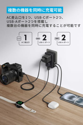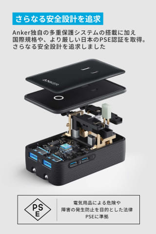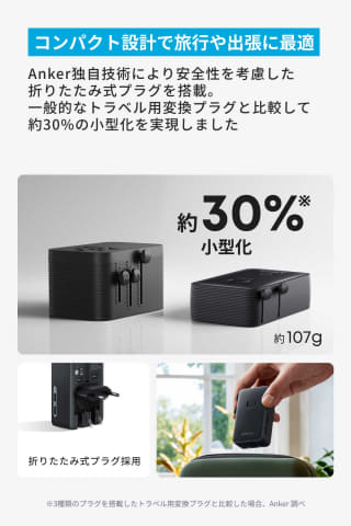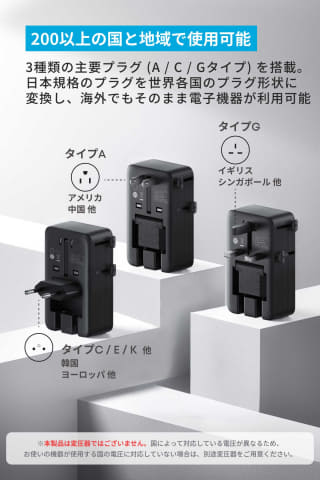 3種類のプラグを搭載し、A/C/Gなどの主要なコンセントタイプに合わせられるため、200以上の国と地域で使用できる。アンカーの独自技術により、折りたたみ時に電源供給を遮断するプラグを採用しているため、感電リスクを低減できる。