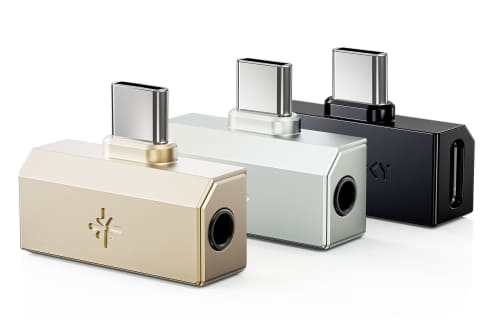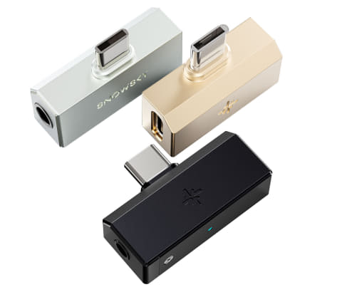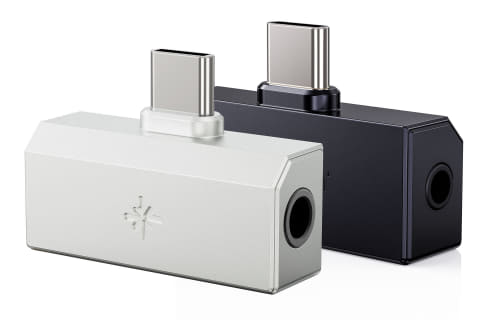 スマホに接続するだけで、ハイレゾ音源を本格再生できるUSB DAC内蔵ポータブルヘッドフォンアンプ。重量は7g(TINY A)/10g(TINY B)と軽量。ケーブル不要のダイレクトプラグイン設計により、デバイスと一体化するように持ち運びできる。T字型ボディと側面に端子を配置したことで、頻繁な抜き差しによる端子の摩耗や損傷を防いでいる。